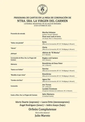 La ciudad de Alcalá de Henares vive un acontecimiento histórico y de profunda devoción con la Solemne Misa Pontifical de Coronación Canónica de Nuestra Señora del Carmen. En el marco incomparable de la Catedral-Magistral, la liturgia se enriquece con la interpretación de la “Misa de la Coronación” en Do mayor, KV 317, de Wolfgang Amadeus Mozart, una de las obras más sublimes del repertorio sacro.